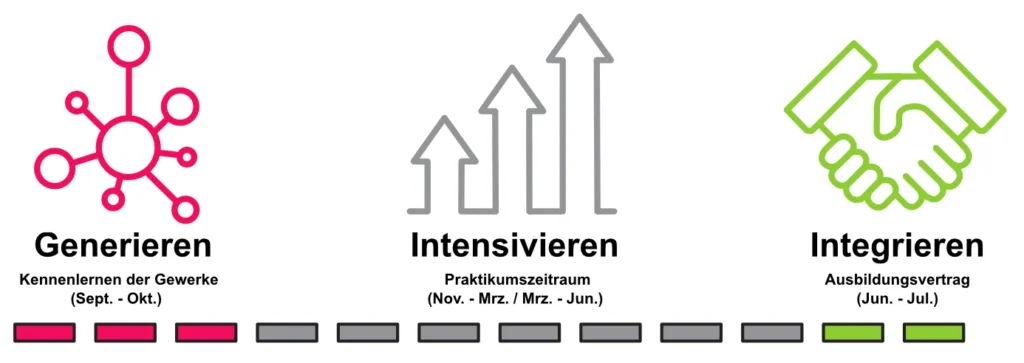 Nach einem erfolgreichen Praktikumsjahr besteht die Möglichkeit, diesen jungen Menschen einen Ausbildungsplatz oder Vorvertrag anzubieten und somit langfristig von ihrer Entwicklung und ihrem Engagement zu profitieren.
